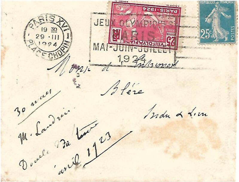 L’enveloppe reproduite ici a été postée le samedi 29 mars 1924 à 19h30 avec la valeur à 25c, soit trois jours avant la date de mise en vente officielle au public. Première date d’utilisation de cette valeur de la série de l’Olympiade 1924 et seule lettre connue à ce jour.