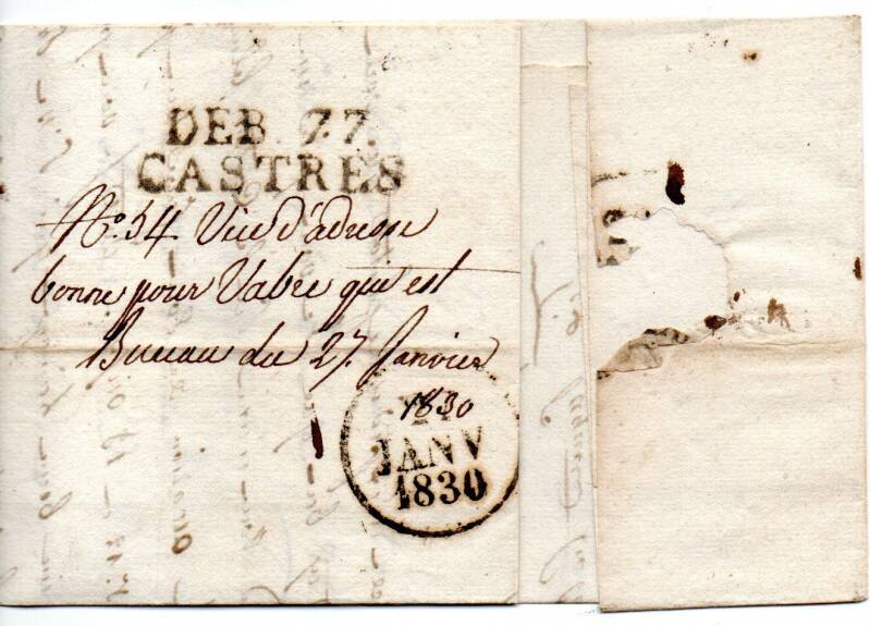 La lettre aurait du être dirigée directement à Vabre puisque depuis le 1er janvier le bureau de Vabre avait acquis le statut de direction. Ainsi le préposé signale un "Vice d'adresse" et précise "Bonne pour Vabre qui est bureau le 27 janvier 1830". Il appose le cachet "DEB 77 / Castres"