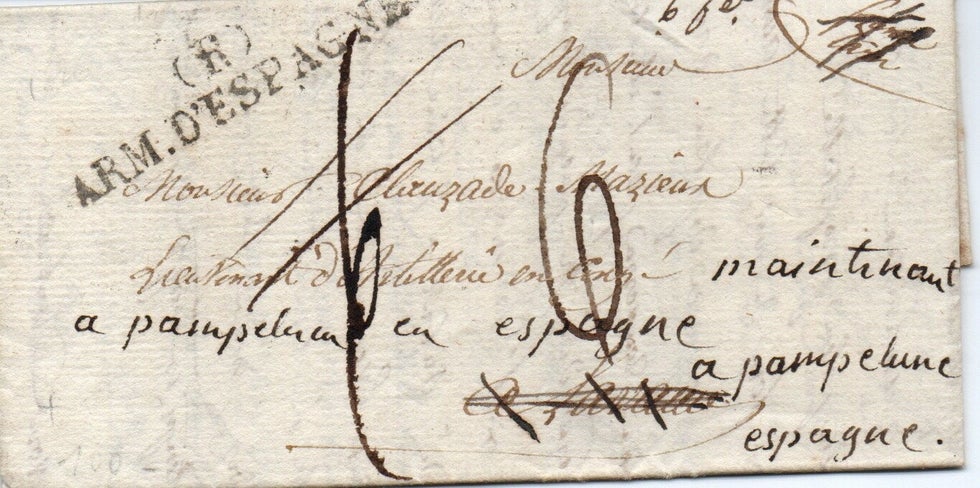 Le destinataire ayant rejoins son armée, le courrier ne peut être distribuer. La mention franc est rayée. la lettre est renvoyée à Pampelune elle est taxée à 6 décimes puis biffée puis retaxée